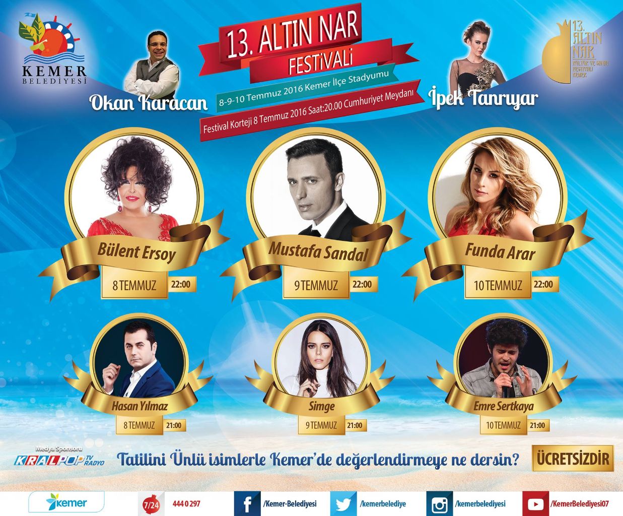 Kemer Belediyesi tarafından bu yıl 13'üncüsü düzenlenen Altın Nar Festivaline birbirinden ünlü sanatçılar katılıyor.