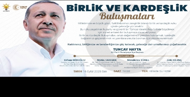 'Birlik ve Beraberlik Buluşmaları 'kapsamında Antalya'da AK Parti Muratpaşa İlçe Başkanlığınca 16 eylül salı günü saat 19.00 da Hilside Su Hotel'de 4 konuşmacının katılacağı bir toplantı gerçekşeltirilecek.